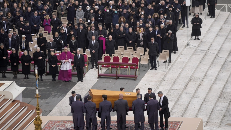 Papa Franja služi sprovodni obred i to je prvi put da poglavar katoličke crkve sahranjuje svog prethodnika posle više od 220 godina, prenosi Bi-Bi-Si.