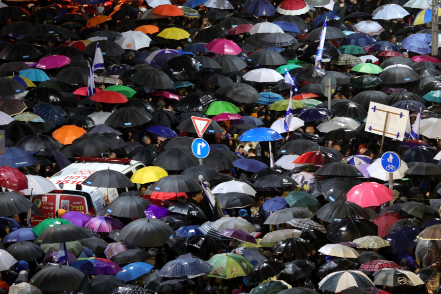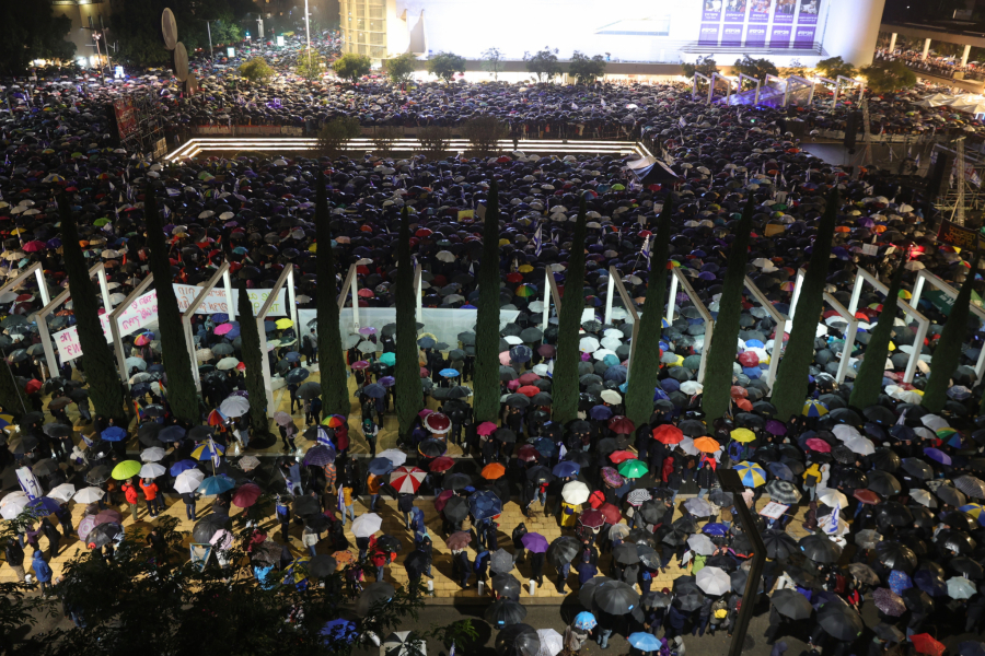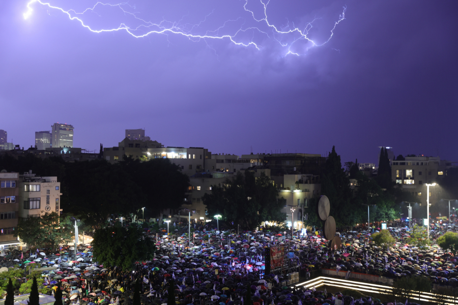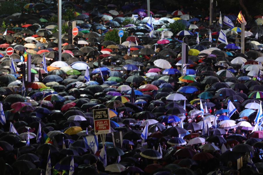 "Uzmite izraelsku zastavu u jednu ruku, kišobran u drugu i izađite da zaštite demokratiju i zakon u državi Izrael", apelovao je bivši ministar odbrane Beni Ganc koji prisustvovao mitingu u Tel Avivu.