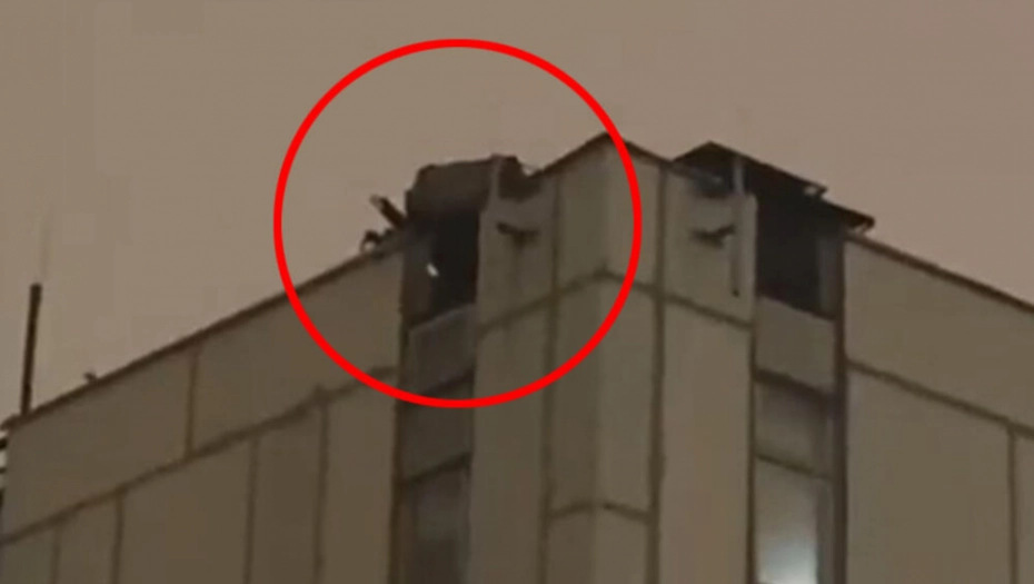 Na jednom od snimaka vidi se ogromna dizalica koja postavlja Pancir na vrh poslovnog centra.