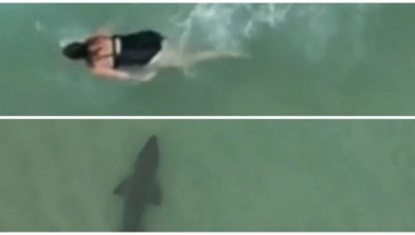 Naime, na snimku se vidi kako se siva ajkula kreće tik pored plivača i kreće ka trojici muškaraca u crnim ronilačkim odelima na plaži blizu Forstera na srednjoj severnoj obali Novog Južnog Južnog Velsa.