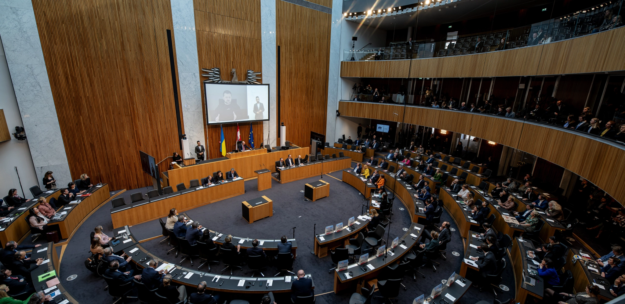 U svom obraćanju, Zelenski je zahvalio Austriji na humanitarnoj pomoći i pomoći u projektima, poput čišćenja mina, dodajući da je "važno ne biti moralno neutralan prema zlu". Austrija nije deo NATO-a i ne isporučuje oružje Ukrajini. Međutim, Ukrajini je pružila humanitarnu pomoć i šlemove i zaštitne prsluke za civilnu upotrebu.