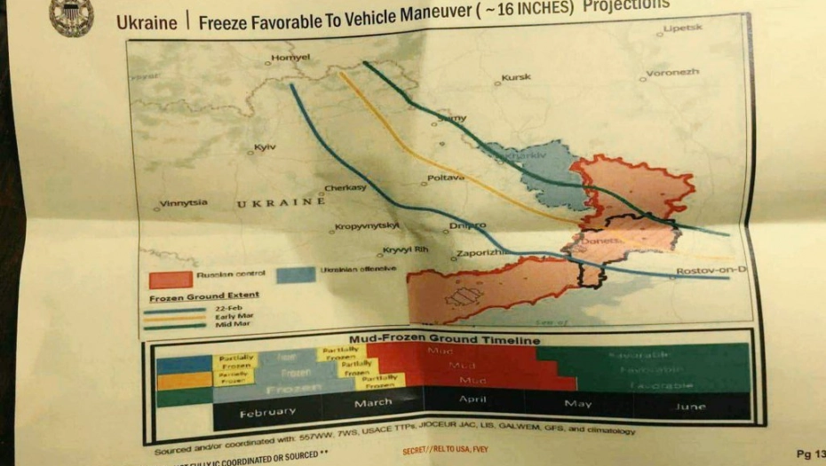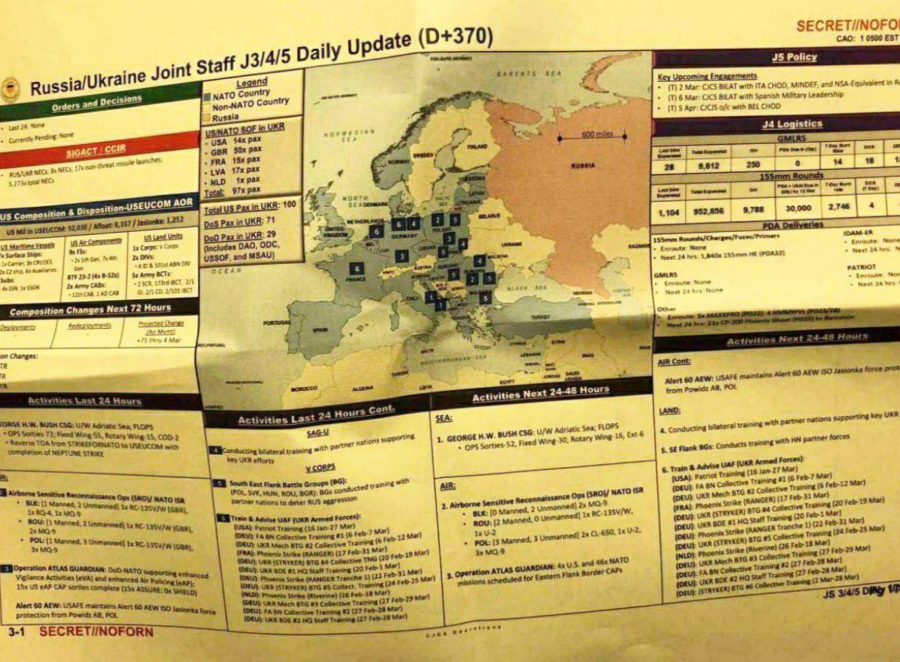 U spisima se nalaze i ukrajinski planovi za naširoko najavljivanu prolećnu ofanzivu, kao i ocena o slabljenju protivvazudušnih sposobnosti te države, te mape i procene snage pojedinih jedinica.