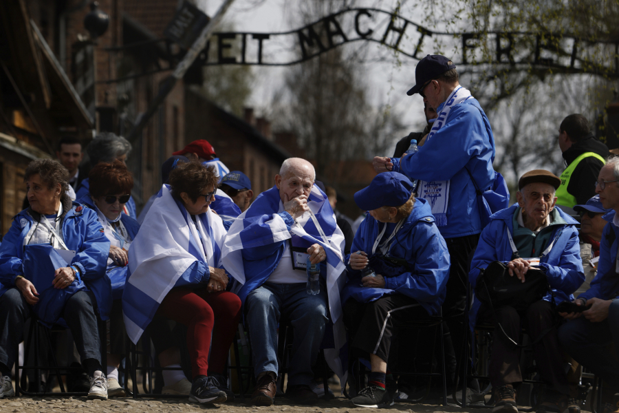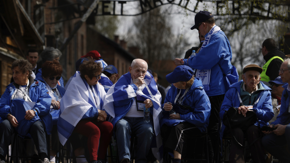 Preživeli, od kojih su neki bili ogrnuti zastavama Izraela, okupili su se uoči marša ispred kapije Aušvica i naptisa "Arbeit Macht Frei" (Rad oslobađa).