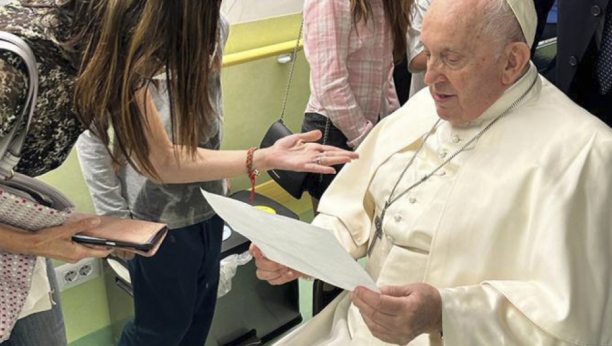 Na fotografiji se vidi kako Franja (86) u invalidskim kolicima obilazi odeljenje za decu obolelu od raka u bolnici Đemeli u Rimu, prenosi Rojters.