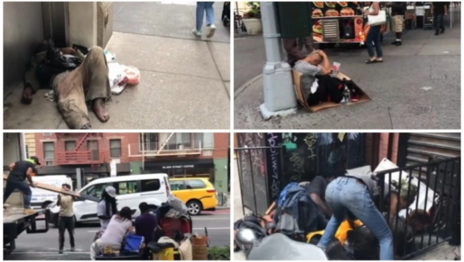 U tri odvojena dana tokom protekle nedelje, Njujork Post je video narkomane kako drsko krek-puše lule u Zapadnoj 43. ulici, dilere droge kako prodaju svoju robu na vidiku policajaca, skitnice i beskučnike gde god mogu da pronađu mesto, i mnoštvo besciljnih migranata koji lutaju.