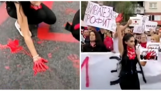 Neki od okupljenih ofarbali su ruke crvenom farbom, a crvenom bojom krupnim slovima na ulici ispred Vlade ispisali: Ubice.