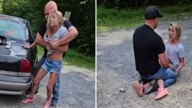 Dejvis se na snimku vidi kako sedi na svojoj bivšoj koja je tvrdila da ju je oborio na zemlju.