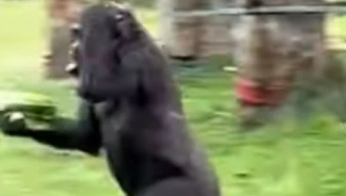 Kamera zatim prati drugu gorilu koja velikom brzinom trči do zaklona, a posebno je smešno što izgleda kao da na glavi nosi bež jaknu?!