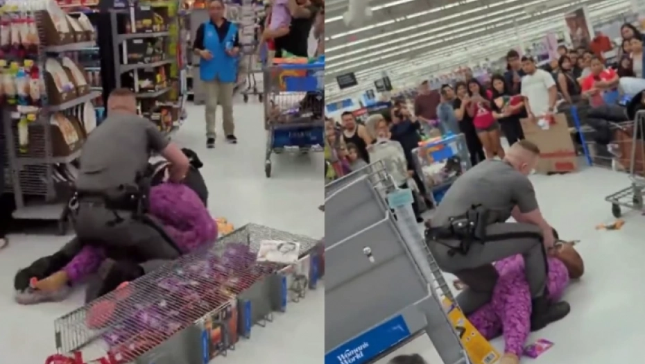Nejasno je zašto je pozvana policija, ali se u snimku vidi da se žena svađa s policajcem, gađa ga i otima se od njega između rafova, da bi na kraju jedan i oborila.