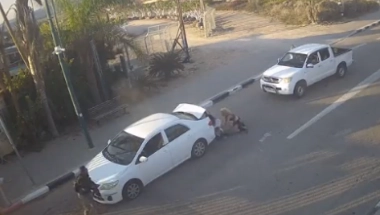 Osam naoružanih Hamasovih terorista iskaču kroz vrata prtljažnika i sam automobil i počinju da jure po zatvorenom kompleksu.