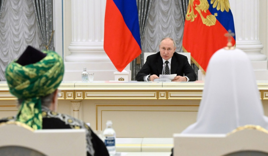 Na sastanku sa ruskim verskim vođama u Ketrin Holu u Kremlju, Putin je bio jedina osoba koja je sedela na jednoj strani velikog pravougaonog stola, dok se oko 12 ljudi gomilalo oko druge, bez ikakvih mera distanciranja.