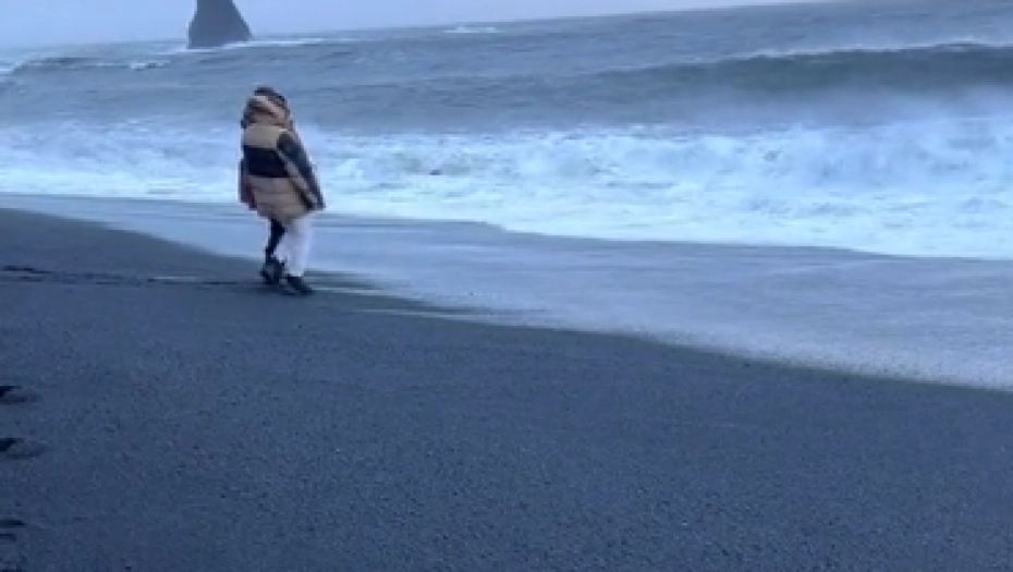Muškarac i žena su se uhvatili za ruke kako bi se fotografisali na Crnoj peščanoj plaži.