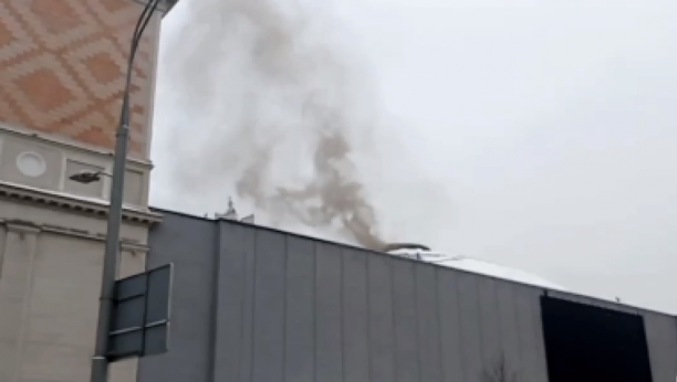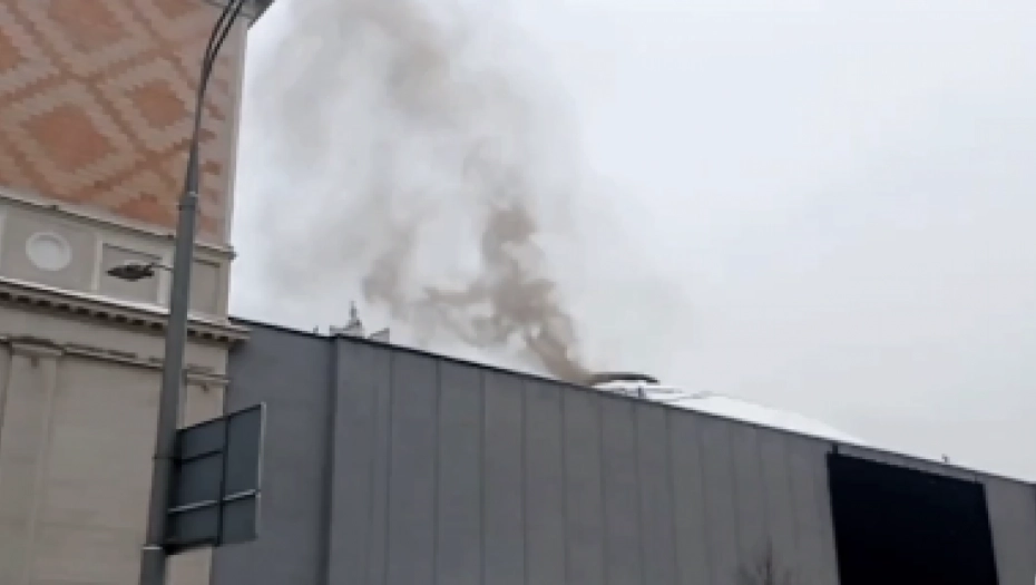 Ispod krova zgrade se dimi, a na licu mesta su vatrogasne službe.