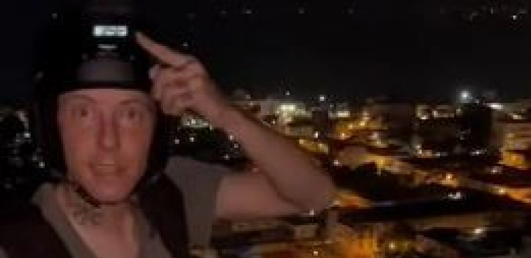 Zastrašujući snimci pokazuju kako on odbrojava „tri, dva, jedan, vidimo se“ pre nego što je skočio u mrak – samo da bi se zavrteo sa malim padobranom koji je mlatarao kroz vazduh dok je padao.