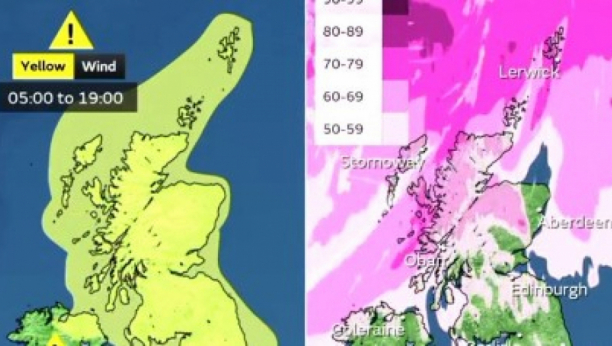 Oluja je danas donela vetrove od 106 milja na sat u Škotskoj. Meteorološka služba Velike Britanije izdala je žuto upozorenja zbog jakih udara vetra, a koje se odnosi na delove severne Engleske, cele Škotske i dela Severne Irske, danas do 19 sati.