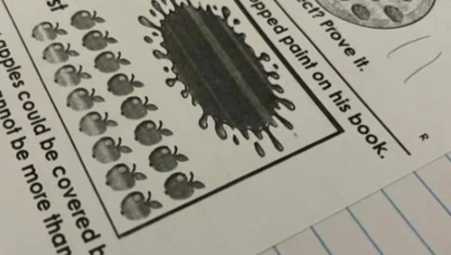 Pitanje u domaćem zadatku glasi: „Deni je ispustio boju na svoju knjigu“, praćeno natpisom pored opcije „najviše“, a 16 jabuka pored „najmanje“. Zatim piše: „Koliko jabuka može biti prekriveno bojom.Ne može biti više od 20".