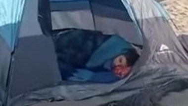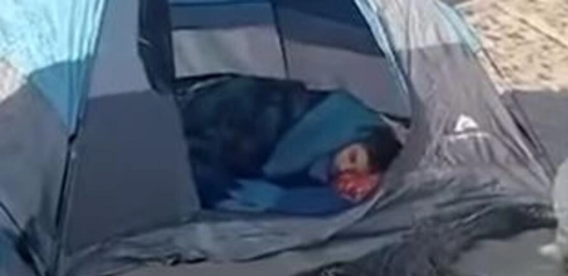 Na snimku se vidi kako mladić mirno spava u svom šatoru boje jarko plavetnila, dok se pored njega, izgleda bez ikakve namere da ga napadne, odmara opasni reptil.