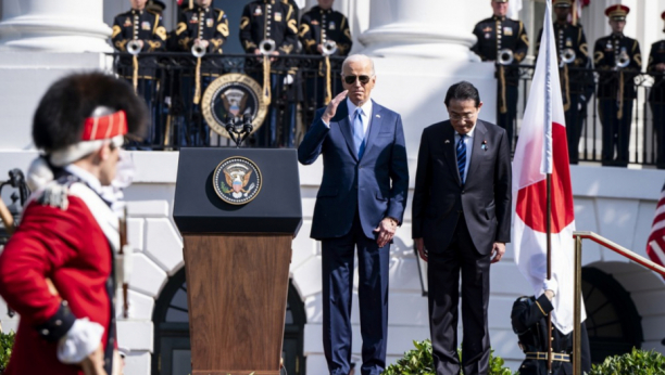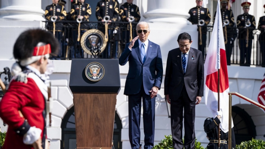 Bajden (81) i Kišida (66) pozdravili su se pre nego što su se rukovali sa članovima delegacije SAD i Japana na Južnom travnjaku. Lideri su zatim pstupili na binu za intoniranje nacionalne himne obe zemlje, pre nego što su pregledali počasnu gardu američke vojske.