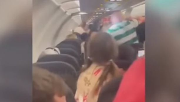 Na snimku se vidi kako razdragani putnik, koji nosi zeleno-belu prugastu majicu fudbalskog kluba Seltik, divlje udara stjuardese koje pokušavaju da ga zadrže.