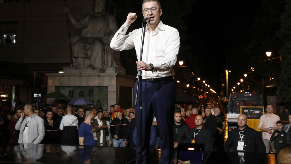 "Mi smo uspeli, vi ste uspeli. Makedonija je pobedila. Istorijska pobeda naroda. Pobedila je Makedonija, koja pripada Makedoncima, Albancima, Turcima, Srbima, Vlasima, muslimanima, ateistima, ponosnim narodima. Vlada je pala, a za to ima razloga. Kriminal, korupcija, konfiskovana država, tenderi, nepotizam i još 100 drugih je razloga zbog kojih je država trpela. Narod je bio razočaran. Večeras su konačno poraženi“, rekao je Mickoski u sedištu stranke, gde je okupljen veliki broj njihovih pristalica.