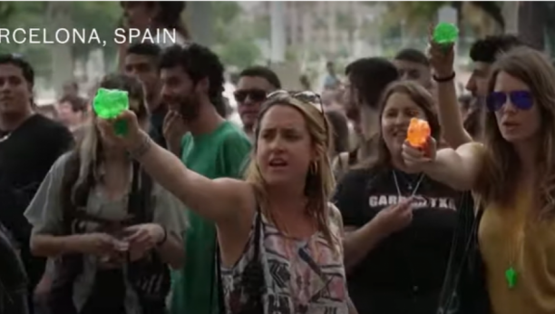Na snimcima načinjenim u ovom španskom gradu vidi se kako ljuti demonstranti tokom vikenda prskaju vodenim pištoljima goste na popularnim turističkim lokacijama.