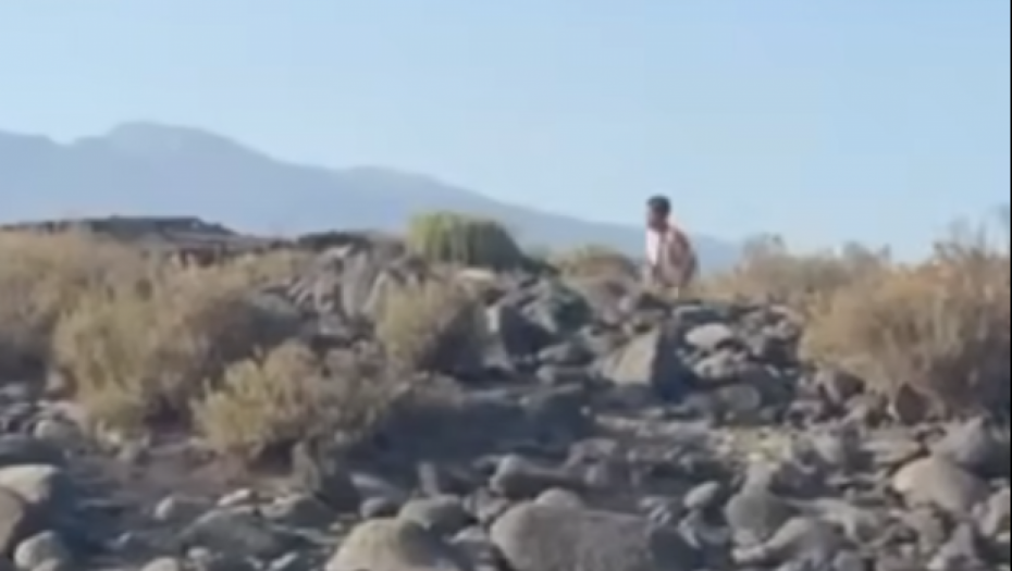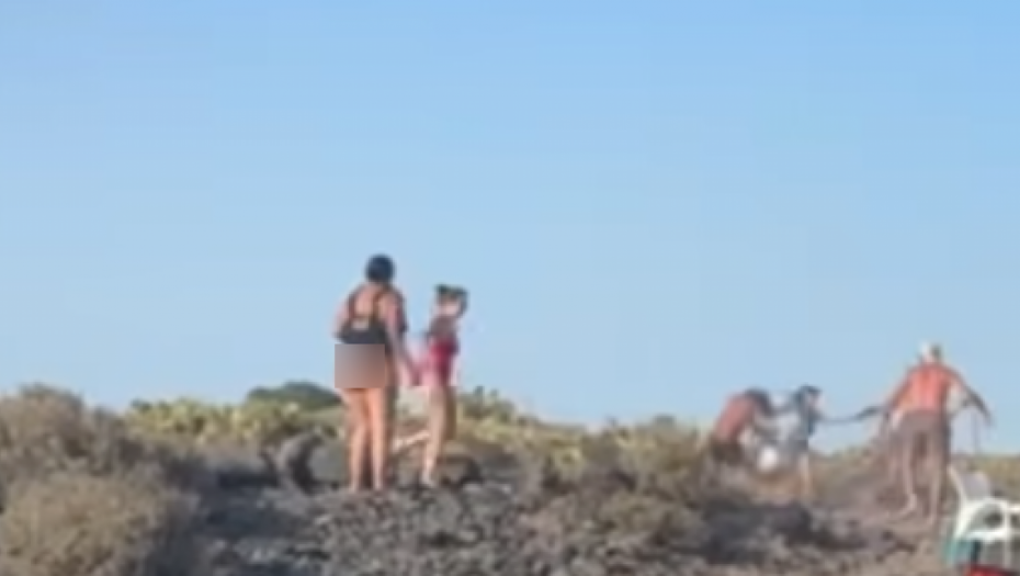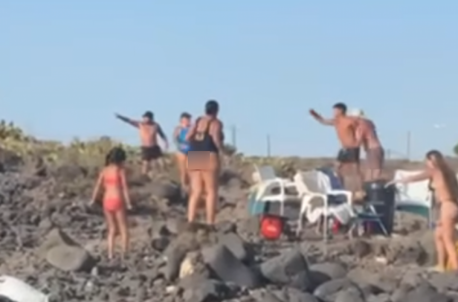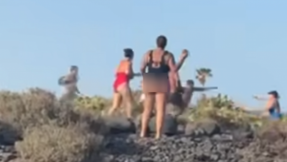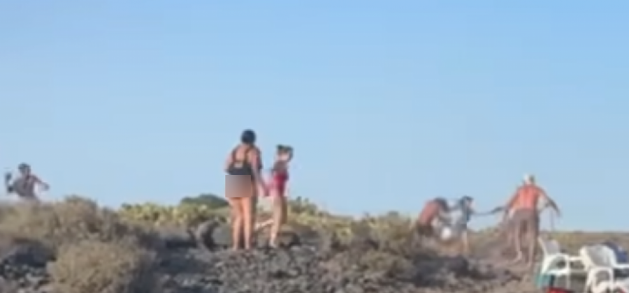Video snimak žestoke tuče na plaži Las Buras prikazuje muškarce i žene u kupaćim kostimima kako vrište i bacaju ogromno kamenje jedni na druge.