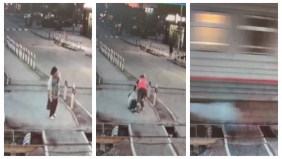 Na snimku se vidi žena kako stoji na prelazu i malim koracima prilazi šinama. Tada na nju iskače Ruskinja u železničkoj uniformi i gura je u stranu.