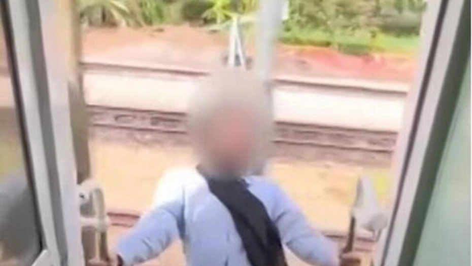 Ubrzo potom, glavom udara u stub pored pruge, gubi ravnotežu, ali se i dalje drži za rukohvate.