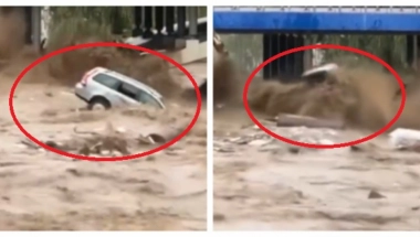 Na snimku se vidi kako bujica tamo nosi auto koji se od siline nanosa zakucao u gredu mosta.
