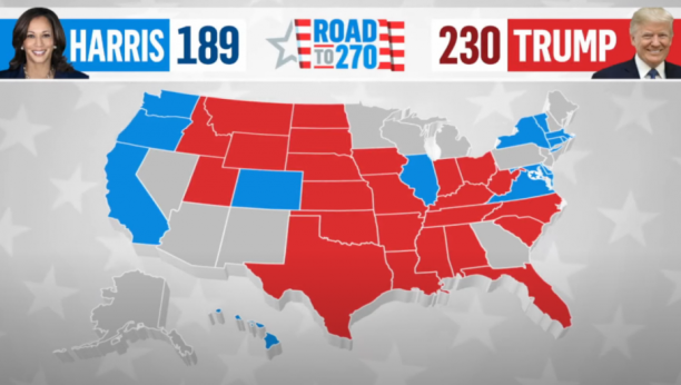 Haris trenutno ima 205 elektorska glasa, Tramp 230. Brojka od 270 elektorskih glasova jeste cifra koju kandidat treba da dostigne da bi postao predsednik.