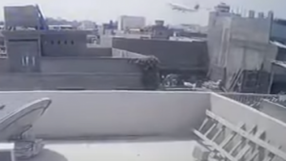 Na snimku se vidi avion koji se spušta, nakon čega se gubi između objekata, a potom se pojavljuje oblak tamnog dima.