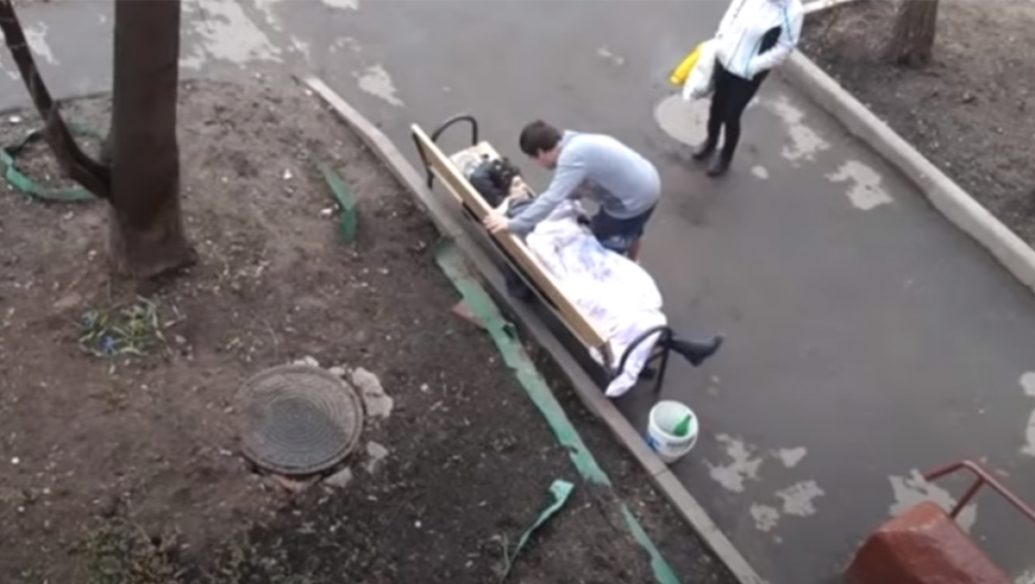 Na snimku koje su zabeležile nadzorne kamere, a koji je objavila REN TV, vidi se kako se žena, koja je identifikovana kao Jelena Čuklova (48) previja od bolova na klupi, dok socijalni radnici i komšije pokušavaju da osiguraju pristup u zgradu.