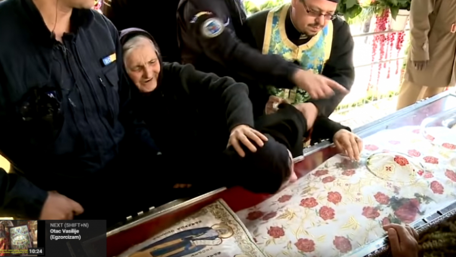 Video snimak pokazuje kako su jednu Rumunku, koja je izbezumljeno vrištala, uz pratnju policije doveli do kivota u kojem se nalaze mošti Svete Petke, da bi je oslobodili od demona koji su je zaposeli.