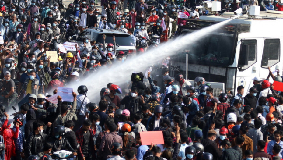 U agencijskom izveštaju se navodi da se na video-snimcima vidi kako policija u prestonici Najpjidu ispaljuje salve iz vodenih topova na hiljade demonstranata i čini se da je više njih tada i povređeno.