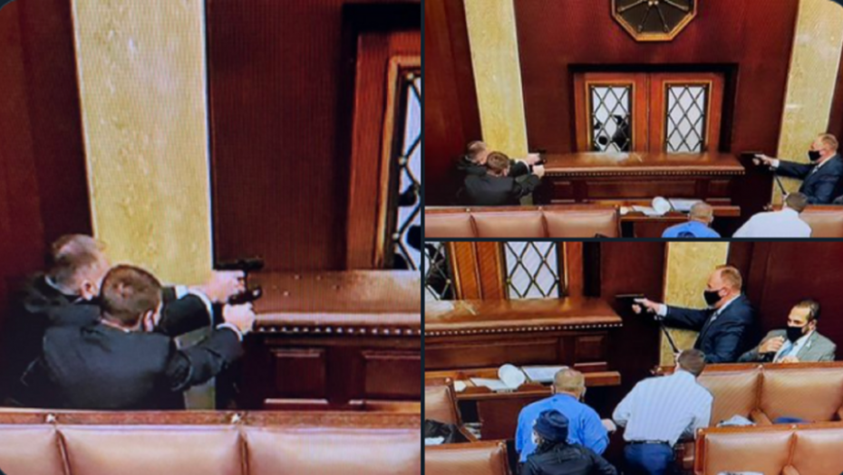 Obezbeđenje u zgradi Kongresa uperilo je vatreno oružje u demonstrante koji su došli pred vrata sale američkog Senata i pokušali da uđu.