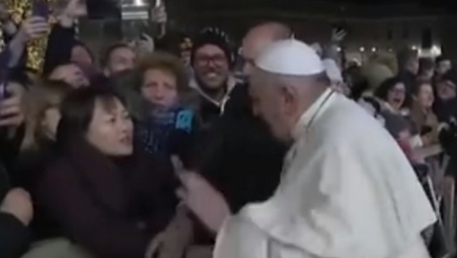 Papa je radosno pozdravljao okupljene kada ga je u jednom trenutku snažno povukla žena. Kako bi se oslobodio njenog stiska, papa ju je udario po ruci, a potom nastavio da hoda.
