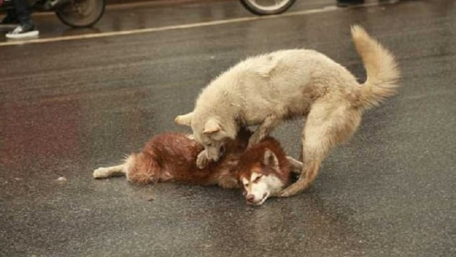 Prelepog haskija juče je pregazio automobil u prometnoj ulici u Kini, a njegov drugar nikako nije mogao da se pomiri sa tim, te je uporno pokušavao da probudi nesrećnog haskija koji više nije davao znake života.