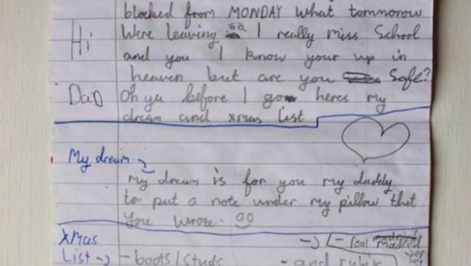 "Hej tata, pišem ti da ti kažem da mi nedostaješ i da ti ispričam novosti. Sigurno već znaš da sam u hraniteljskoj porodici jer je mama bolesna, a meni je uho začepljeno od ponedeljka. Sutra odlazimo. Stvarno mi nedostaje škola i nedostaješ mi ti. Znam da si u Raju, ali jesi li dobro? Pre nego što završim, evo ti spisak mojih snova i želja.