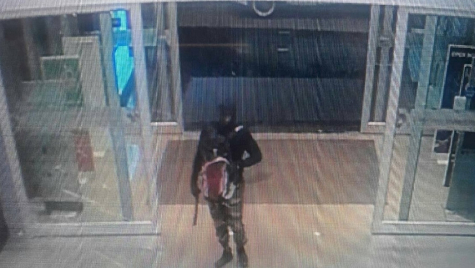 Nadzorna kamera snimila je muškarca sa skijaskom kapom koja prekriva celo lice i kamuflažnim pantalonama kako iz pištolja sa prigušivačem puca na mušteriju i prodavca.