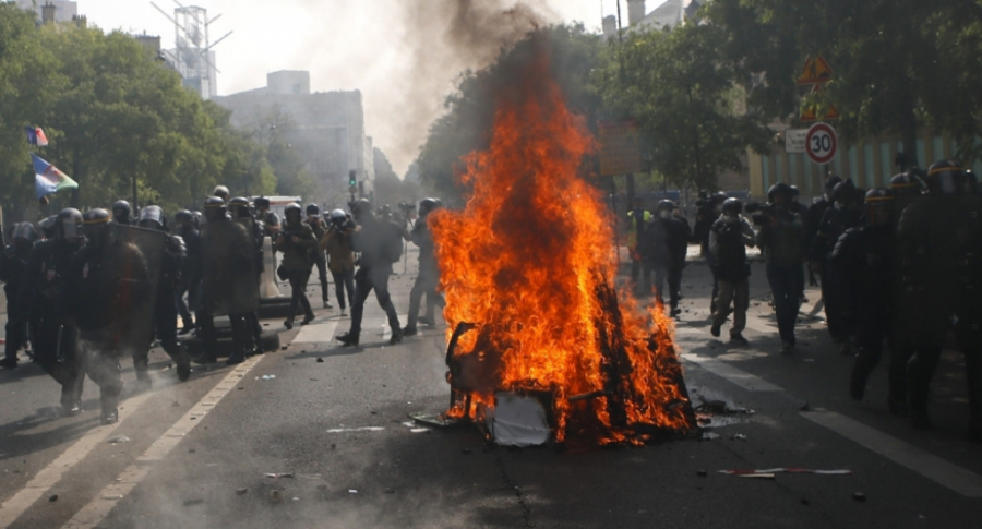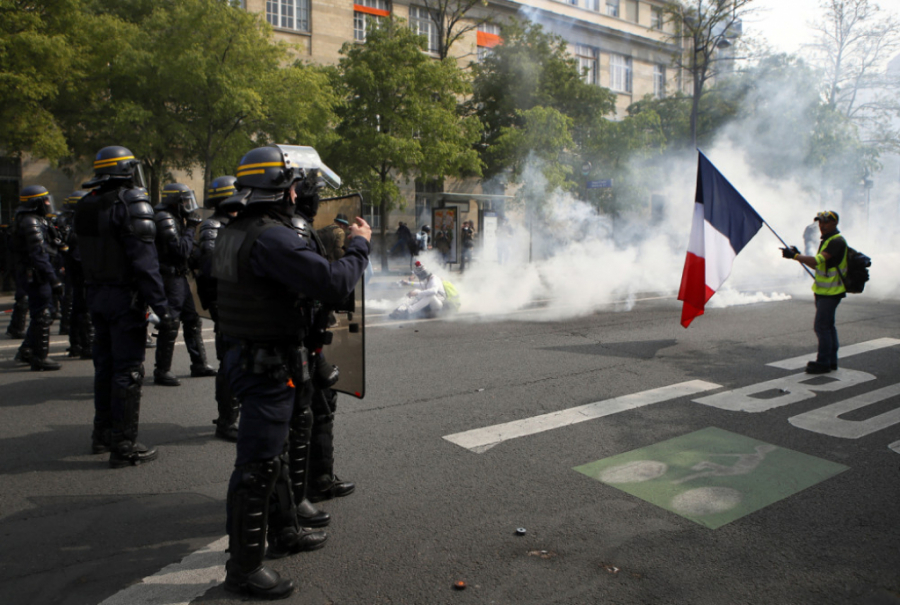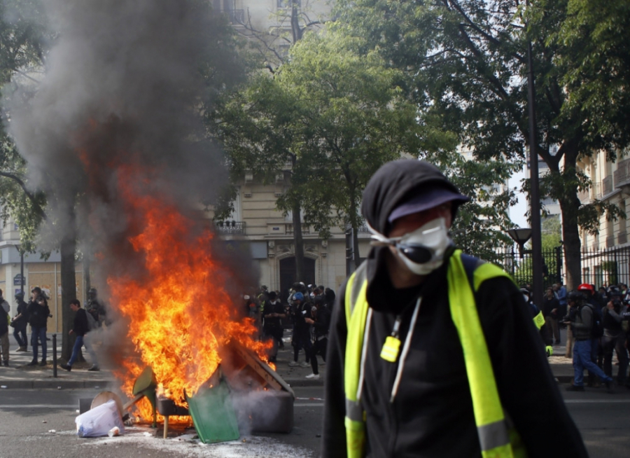 Jedna grupa ljudi obučena u crno uzvikivala je anti policijske parole i mešala se sa drugim demonstrantima koji us nosili žute prsluke i nosili zastave sindikata, a neki od njih su bacali kamenje i druge predmete na policajce, napadali parkirana kola, šutirali ih i razbijali prozore.
