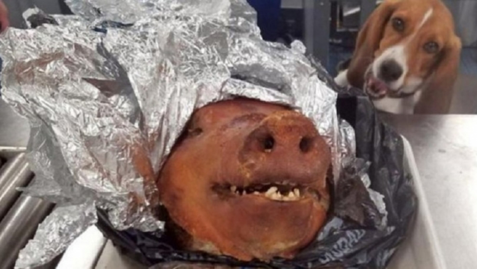 Američka služba carine i zaštite granice kaže da je pseći "sanitarni inspektor" po imenu Hardi upozorio na komad prtljaga na aerodromu Atlante 11. oktobra. Potom su specijalci za poljoprivredne proizvode u koferu našli pečenu svinjsku glavu od dva kilograma i uništili je jer je zabranjen samostalni uvoz hrane u SAD.
