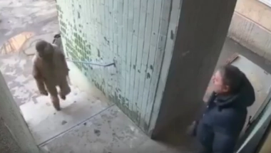 Na snimku se vidi kako muškarac u poslednjem trenutku uspeva da pobegne od grupe vojnika, trčeći ka ulazu jedne stambene zgrade.