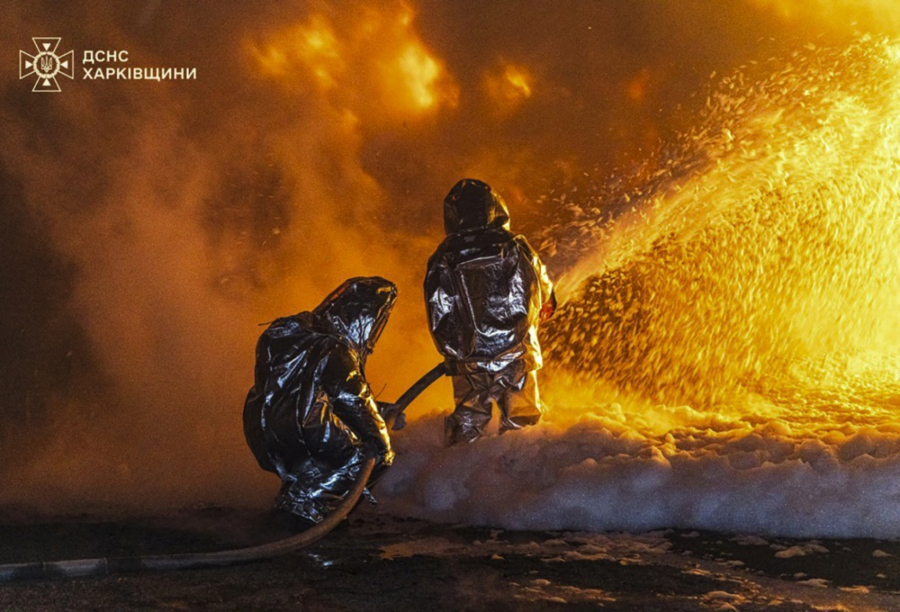 Ukrajinski spasioci rade na gašenju požara na mestu napada ruskog drona u gradu Čugujevu, u Harkovskoj oblasti, Ukrajina: