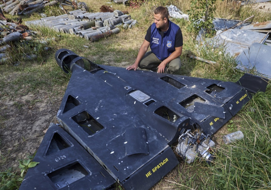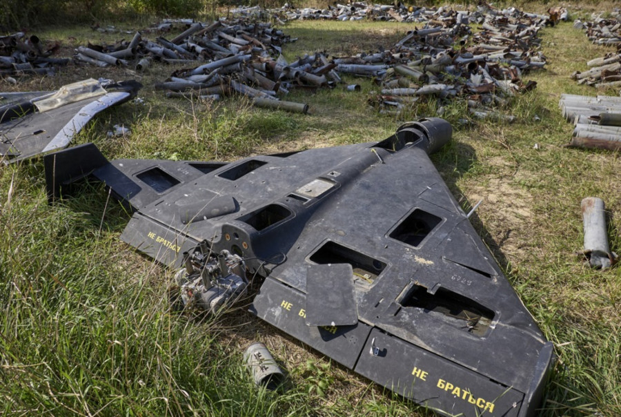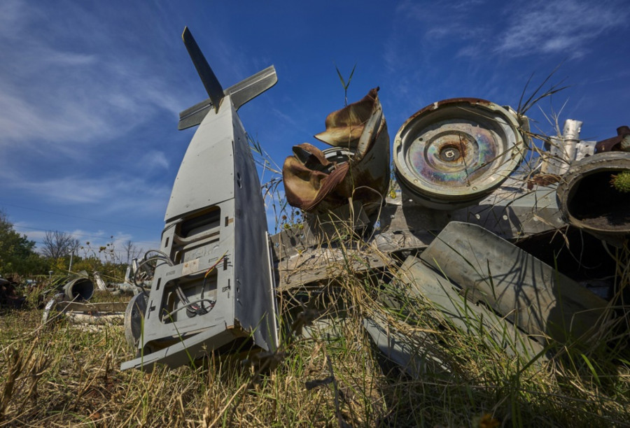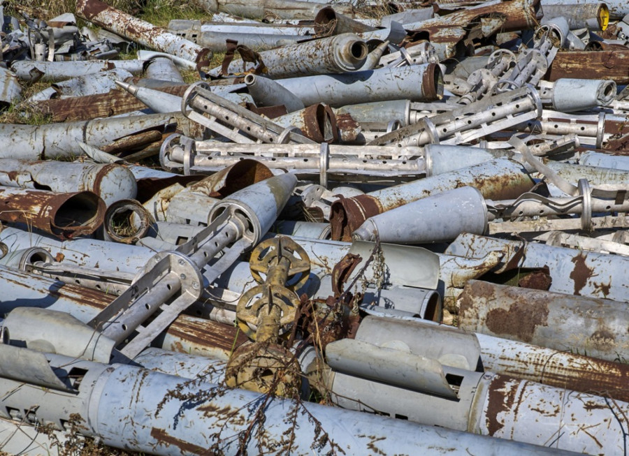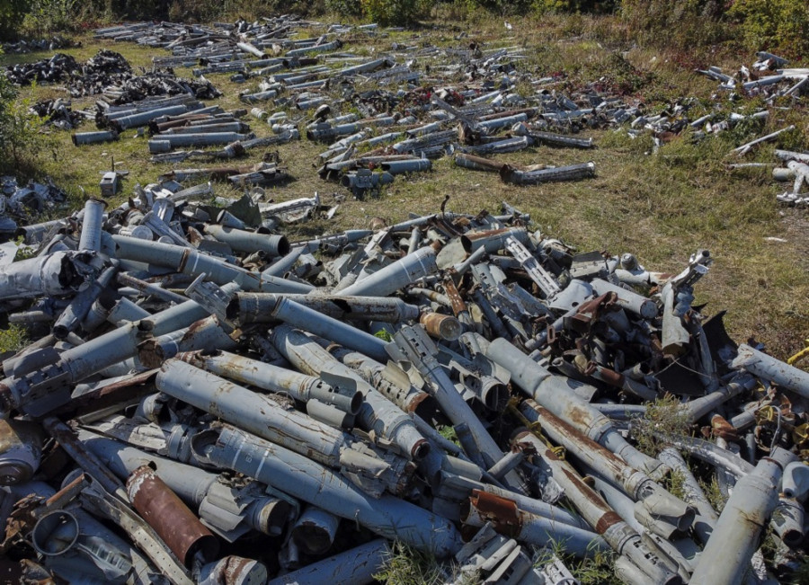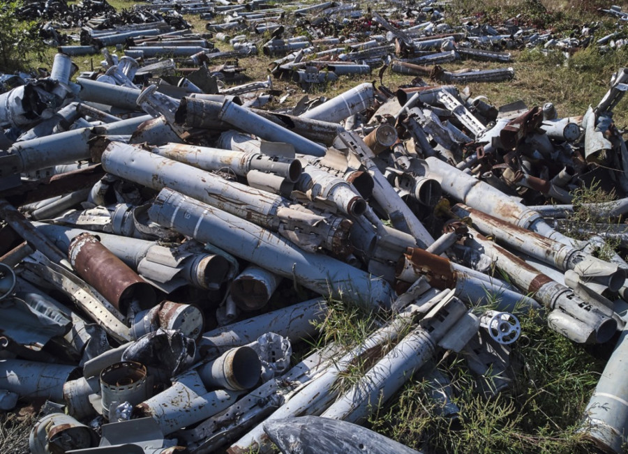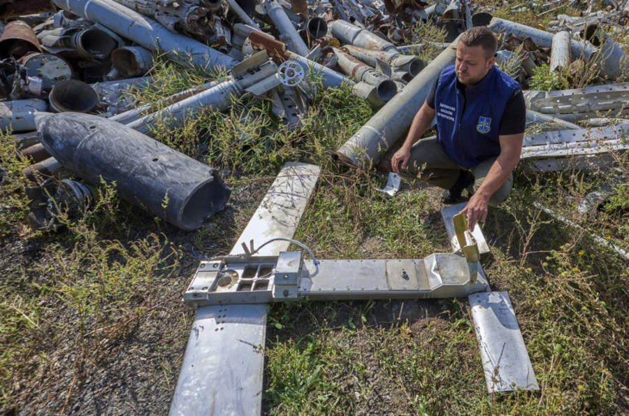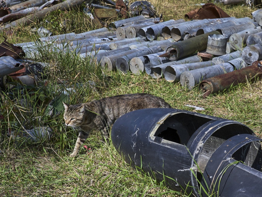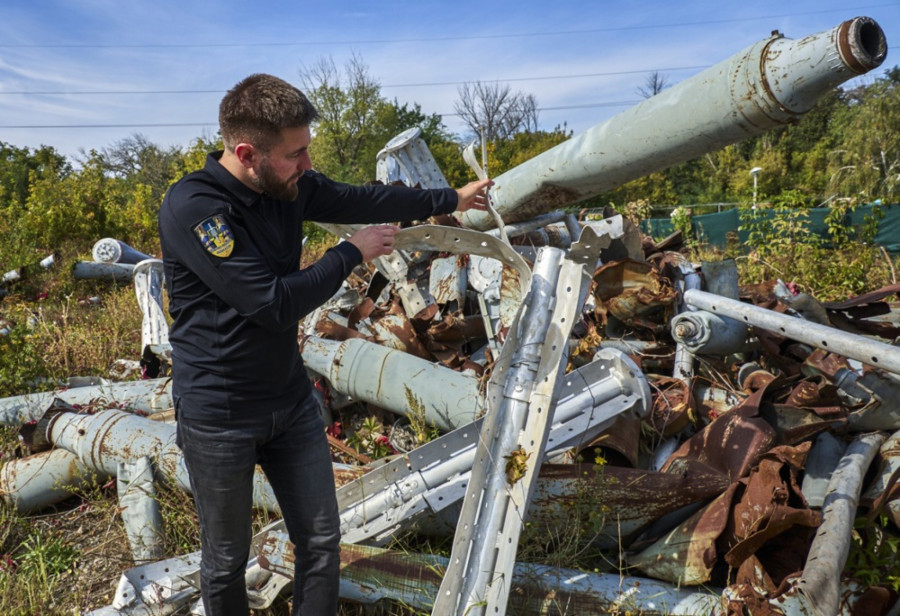 Zaposleni u Harkovskom regionalnom tužilaštvu pregleda vojne ostatke, uključujući rakete, dronove i municiju, prikupljene i skladištene kao dokaz ruskog granatiranja, u Harkovu, na severoistoku Ukrajine, 19. septembra ove godine: