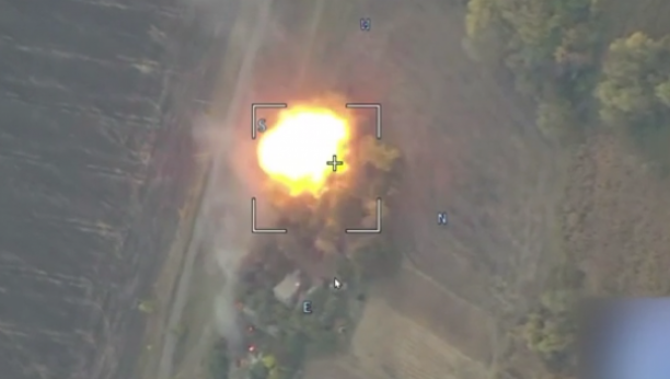 Na snimku se vidi kako nakon pogodaka dronova u zgrade i objekte ukrajinskog punkta dolazi do eksplozija i izbijanja požara.
