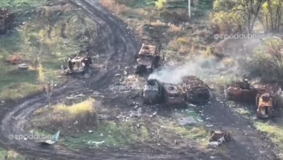 Na snimku se jasno vidi kolona uništenih oklopnih vozila ukrajinske vojske (UOS) koja su ostala na putu, blokirajući prolaz. Prema rečima autora objave, ruski operateri dronova su „dodali“ još dva uništena oklopna vozila na već postojeću kolonu, čime se broj uništenih jedinica dodatno povećao.