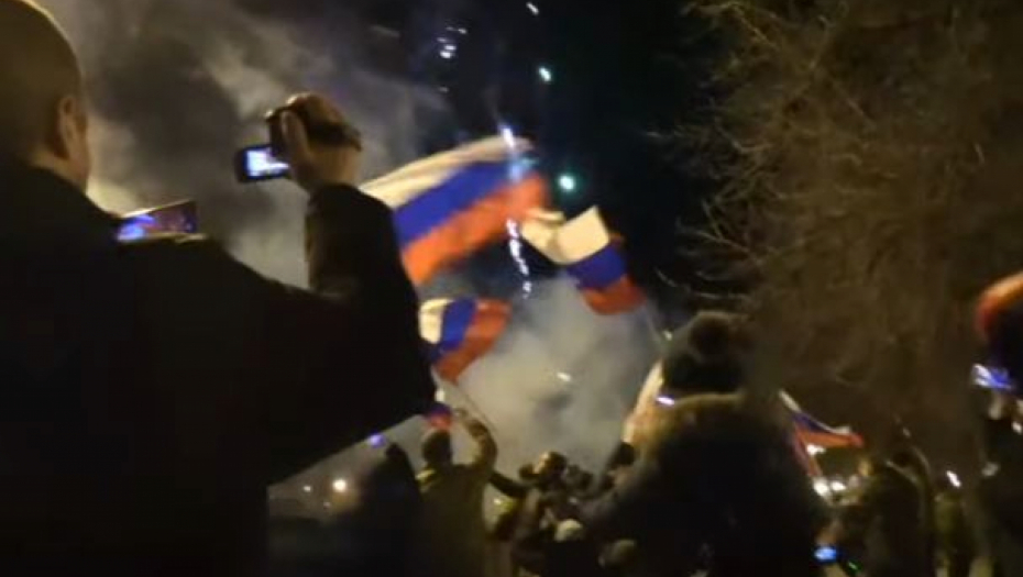 Prema izjavi jednog očevica na kojeg se poziva Rojters, ruska ambasada u Kijevu skinula je zastavu sa svoje zgrade.