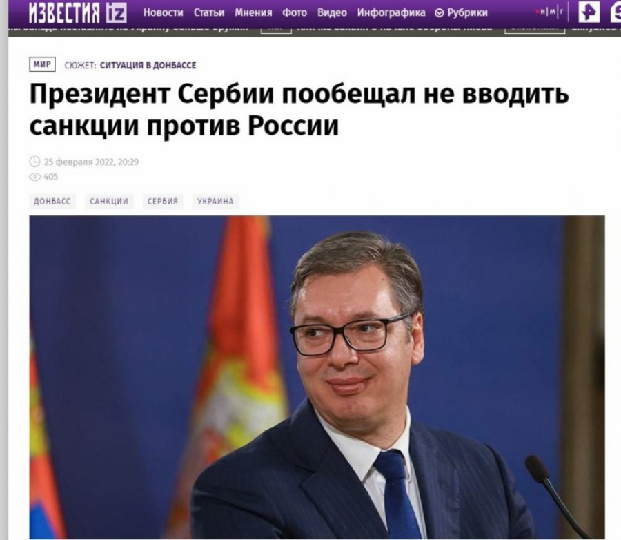 Pre tri dana, Vučić je izjavio da je odluka njegovog ruskog kolege, Vladimira Putina, o priznanju nezavisnosti republika Donbasa "promena svetskog poretka" i dodao da zbog toga Beograd može da očekuje povećani pritisak zapadnih država da se uvedu sankcije Rusiji. Po rečima srpskog lidera, predsednik Francuske Emanuel Makron ga je upozorio da opasnost širenja ovog konflikta na druge delove Evrope i sveta, uključujući i zapadni Balkan", zaključuje "Izvestija" svoju vest o današnjem obraćanju predsednika Republike Srbije.