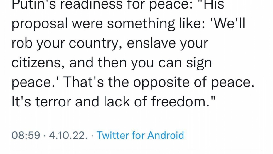 - Njegov predlog je nešto poput: Opljačkaćemo vam zemlju, porobiti vaše građane, a onda možete da potpišete mirovni sporazum. To je suprotno od mira. To je teror i nedostatak slobode - poručila je Berbok.