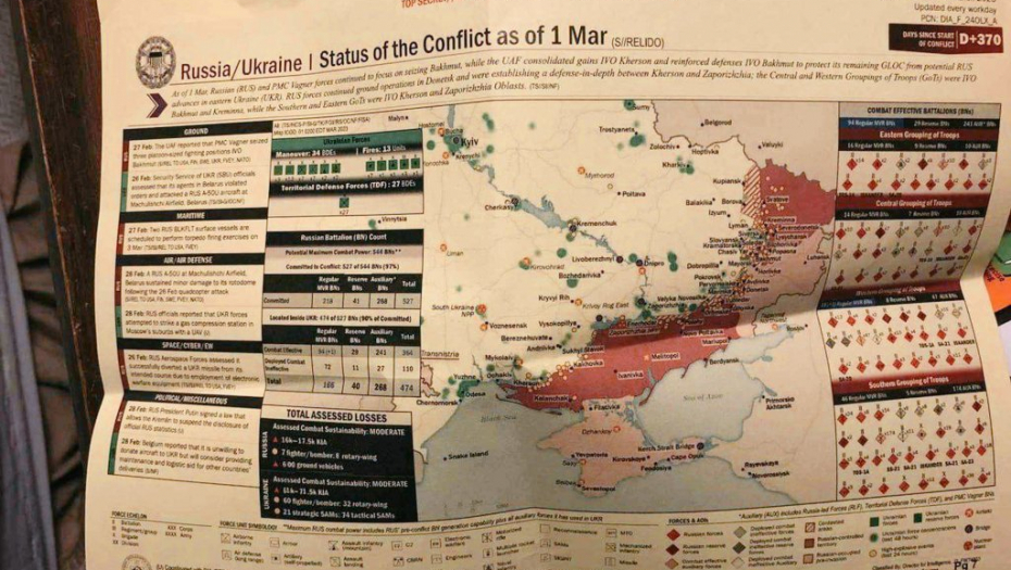 10:58 - Francuska je saopštila Italiji da savremeni sistem PVO Samp/T, koji su dogovorile da pošalju Kijevu, neće biti spreman za isporuku do juna iako je ranije najavljivano da će sistem stići u Ukrajinu ovog proleća, piše list „Politiko“, pozivajući se na tajna dokumenta Pentagona koja su procurila u javnost.